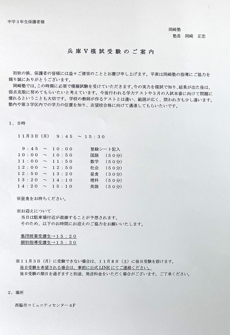11月3日(月・祝)に、中学3年生対象の「兵庫V模試」を実施いたします。