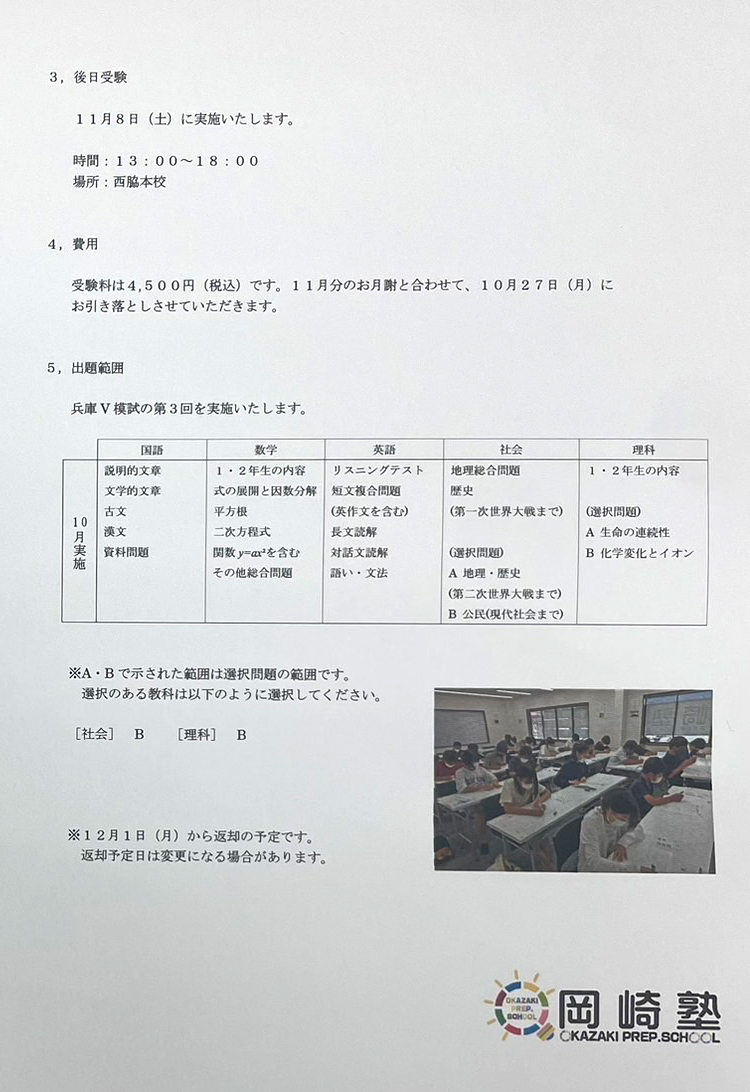 もし都合が合わず受験できない場合は、11月8日(土)13:00〜18:00(西脇本校)に後日受験が可能です。