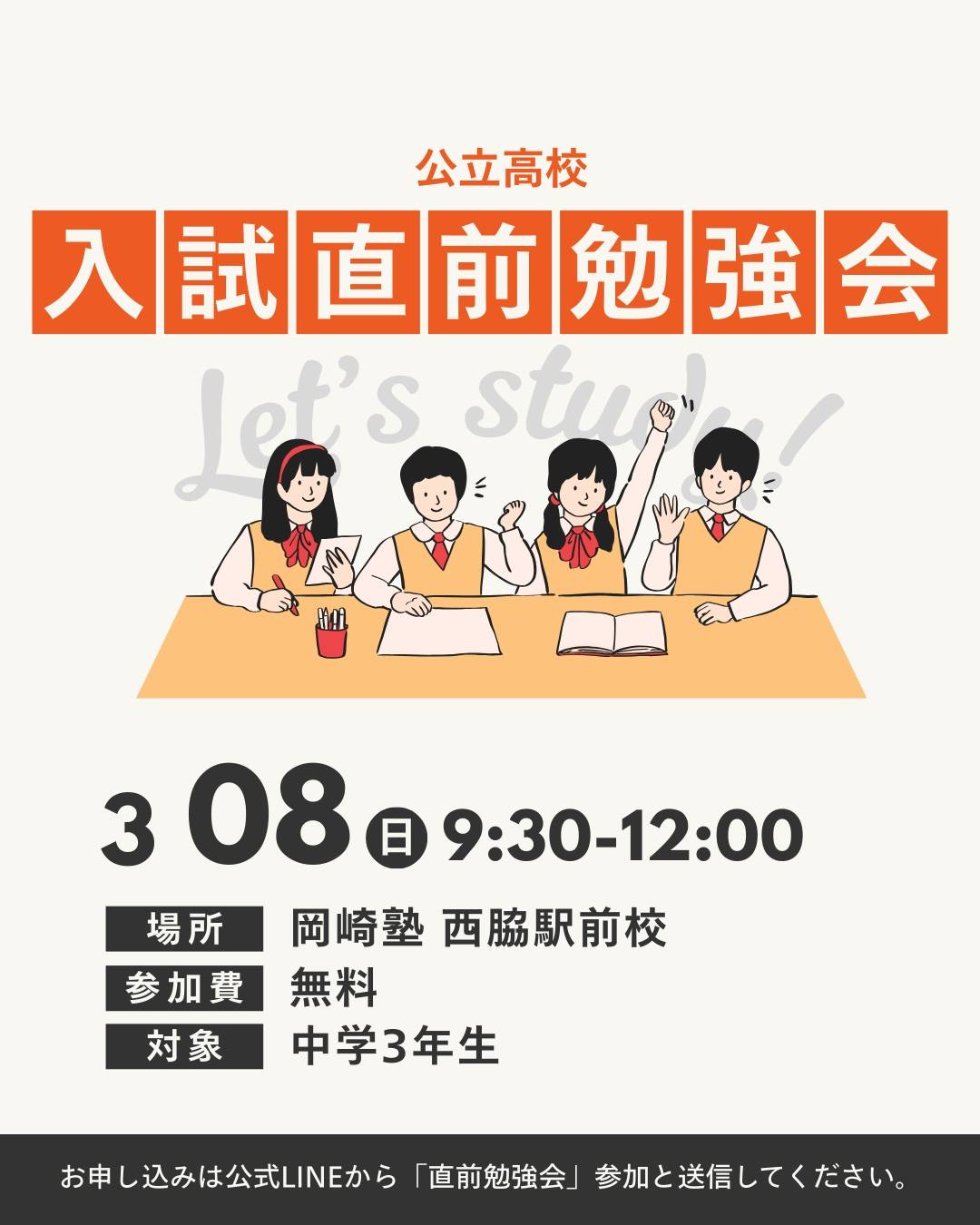 ご参加をご希望の方は、公式LINEに「直前勉強会」参加とご入力のうえ、メッセージをお送りください。
