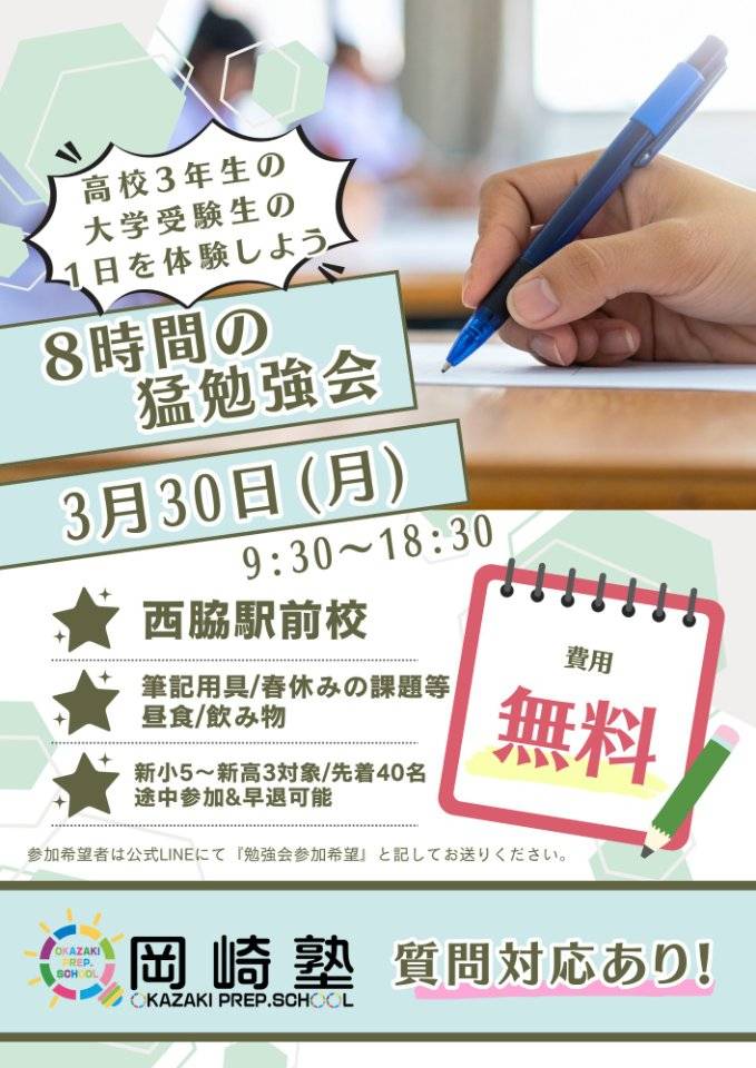 新小学5年生〜新高校3年生を対象に、この春休みの1日を使い、前学年の復習や春休みの宿題、模試の解き直しや岡崎塾のテキストのやり切れなかったページに取り組んでほしいです。