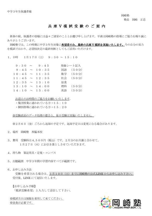 岡崎塾では、この時期に中学3年生対象に希望者のみ、最終の兵庫V模試を実施いたします。
