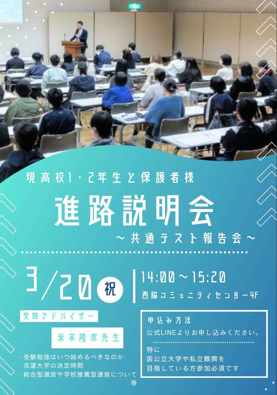 参加ご希望の保護者さまは、「進路説明会」参加希望と入力し、公式LINEのメッセージにてお申し込みください。